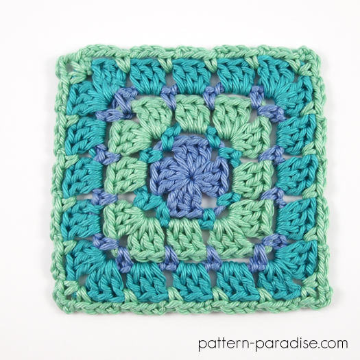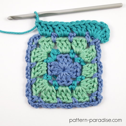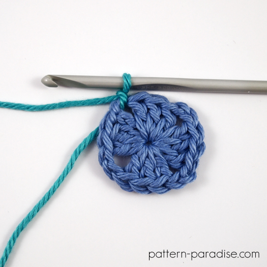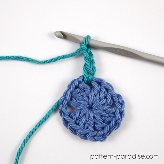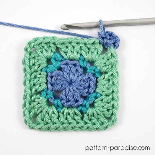 - hæft efter hver runde og sæt den nye farve i hjørnekæden-2 eller kæde-3-rummet i den foregående runde