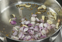 Scaldare l’olio in una padella e aggiungere i semi di senape, una volta che i semi si sputano aggiungere i semi di cumino e i semi di finocchio, mescolare e aggiungere l’aglio , quindi lo scalogno (tagliato a pezzetti), soffriggere per 2 minuti e quindi aggiungere la polvere di masala – curcuma, polvere di coriandolo, polvere di peperoncino rosso.